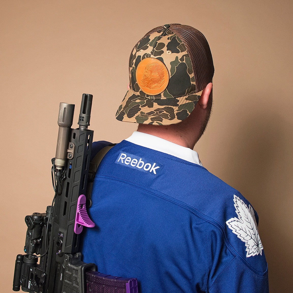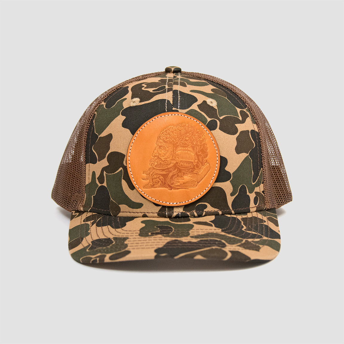 Classic six-panel cotton trucker hat. Pre-curved bill, polyester mesh back with Snapback adjustment. Vintage Duck camouflage pattern. High quality detailed circle leather patch front. One size fits most.