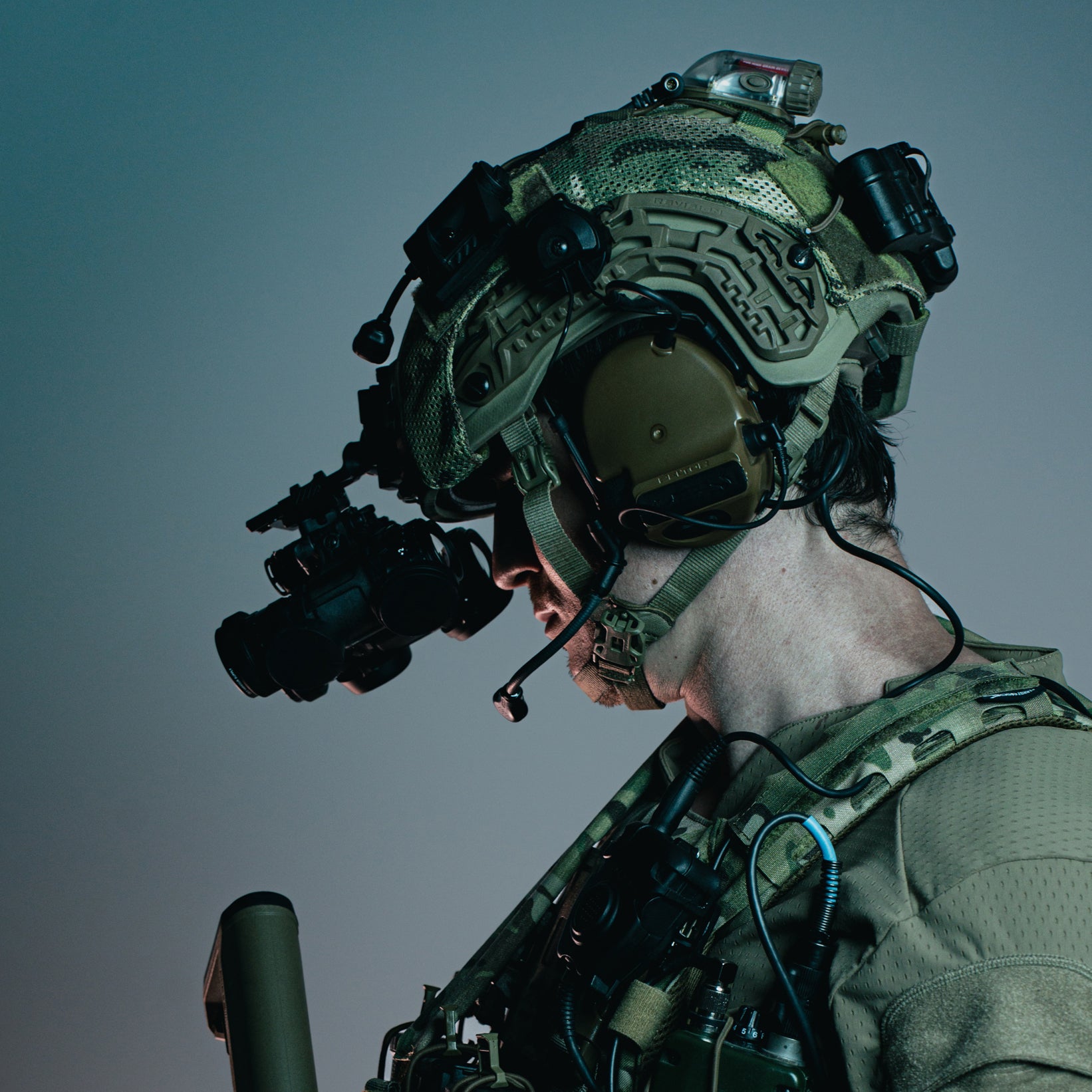Vertical laser cut passthroughs are cut on either side of the shoulder pad closure for comms routing and cable management. Allows for hearing protection down- leads to be neatly tucked away and secured.